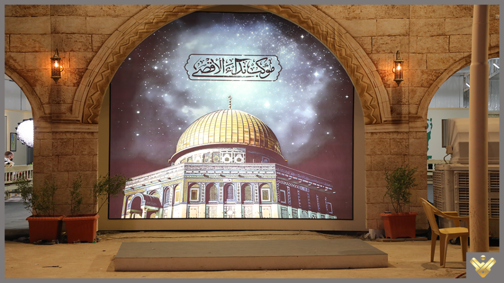 Banner depicting Al-Aqsa Mosque on the Mshaya road between Najaf and Karbala during Arbaeen 2023.