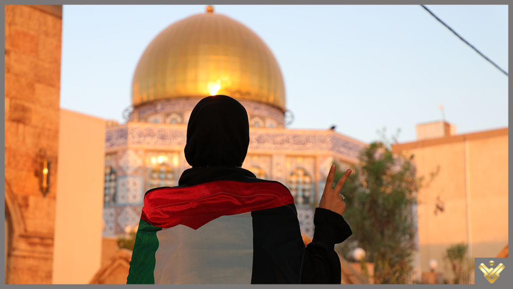 Female plgrim wearing the Palestinian flag near a photo depicting Dome of the Rock in the holy city of Al-Quds during Arbaeen commemoration.