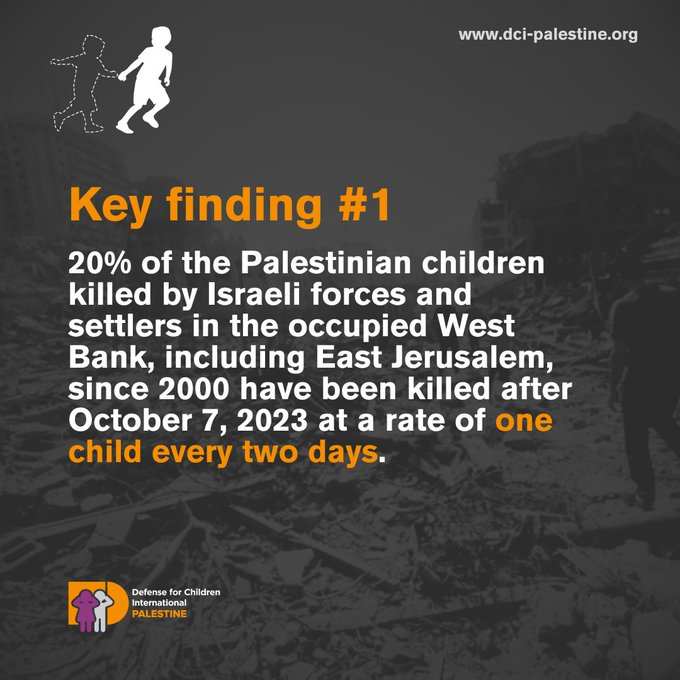 - 20 percent of the Palestinian children killed by Israeli forces and settlers in the occupied West Bank, including East Jerusalem, since 2000 have been killed after October 7, 2023—a rate of one child every two days;