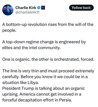 Charlie Kirk defended Trump’s advocacy for “regime change” in Iran as support for what he called an “organic uprising” against the mullahs, rather than a top-down decapitation, the ‘bad kind’ of regime change. Over the past week, Charlie has repeatedly moved the goalposts for Show more