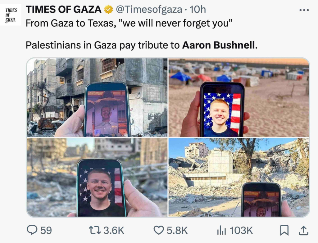 Aaron Bushnell identified himself in the livestream video as he walked toward the Israeli embassy as “an active duty member of the U.S. Air Force” adding that “I will no longer be complicit in genocide.” He then lit himself ablaze and yelled “FREE PALESTINE!” over and over. –Sam Husseini (where you can watch the uncensored video)