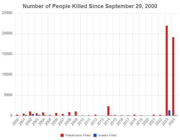 At least 51,560 Palestinians and 2,803 Israelis have been killed by someone from the other side since 2000.