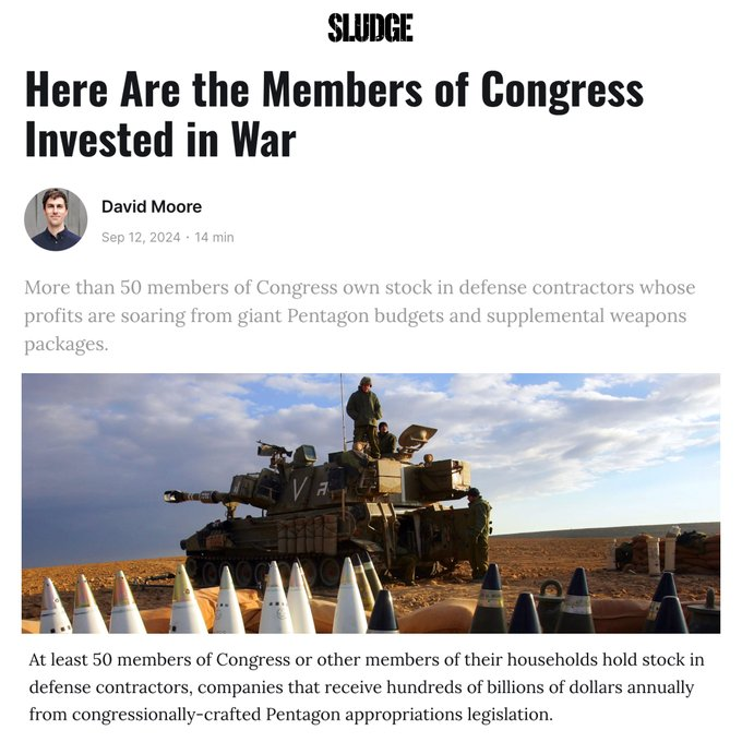 Over 50 members of Congress, who vote to approve the military budget and approve the sale of weapons, own up to $10.9M in military contractor stocks. Military contractors have also donated $29M this year to election campaigns. That isn’t national defense. That’s corruption.