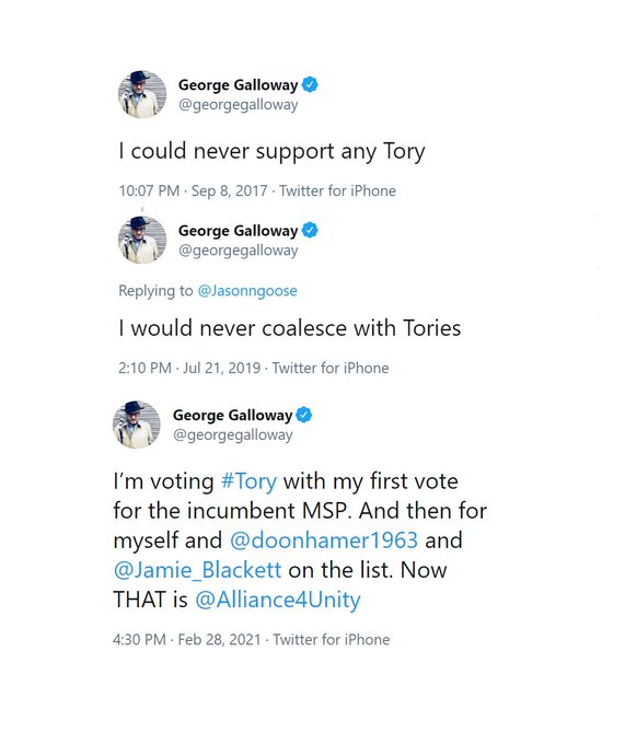 Today, following the social media storm, Galloway proudly announced that actually he had sacrificed all his principles in the name of the United Kingdom. Just like a true patriot.