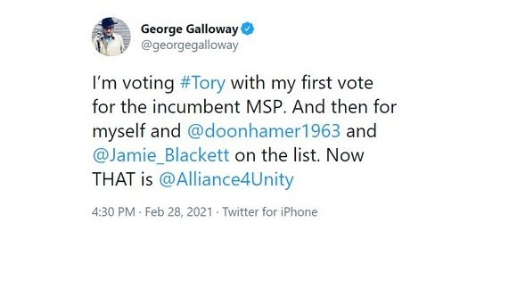 He wrote on the social media platform: “I’m voting #Tory with my first vote for the incumbent MSP. And then for myself and [other A4U candidates] on the list. Now THAT is @Alliance4Unity”