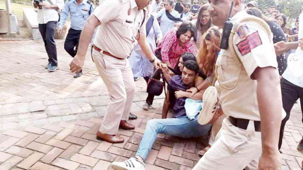 The students and teachers were beaten and detained by Delhi Police on 15 October from Delhi University while they gathered for a protest called by AISA demanding release of Prof GN Saibaba and others as ordered by the Bombay HC. As soon as students gathered at Arts Faculty, a brutal repression was unleashed by the authorities and Delhi Police. Students were beaten, manhandled and injured when the police forcibly detained them. The protesters were taken to Burari Police Station where a protest public meeting took place.