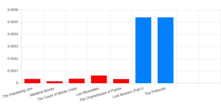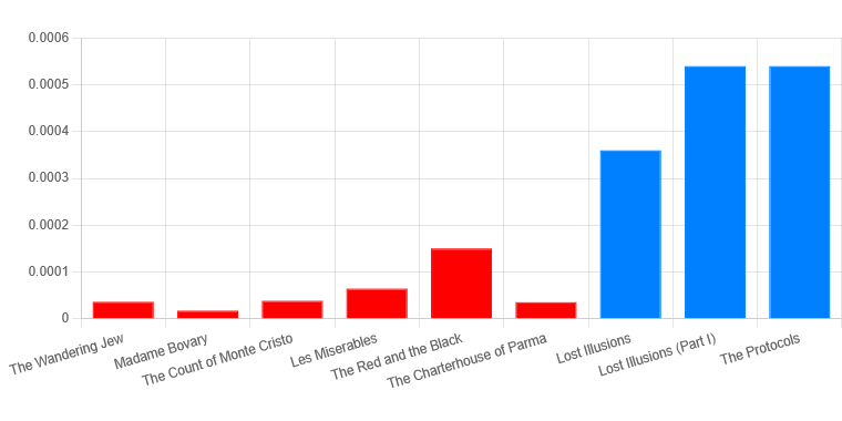 As you can see, Lost Illusions and the Protocols come in roughly similar, more than double the next closest and around 10x as much as the average. The only one somewhat close was The Red and the Black by Stendahl, but this appears to be an outlier and I included Stendahl’s next most popular work (according to Goodreads), The Charterhouse of Parma, to illustrate that. I believe this analysis understates the similarity though. Lost Illusions is divided into three parts and it is the first part that lays most of the thematic foundation. I included Part I alone to show that it is a near exact match. If we graph this while removing the outlier and the whole of Lost Illusions, the comparison becomes even more stark: