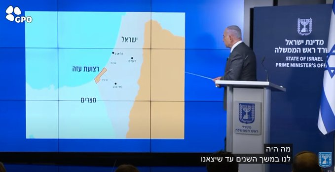 Speaking about the importance of the Philadelphi Corridor between Gaza and Egypt, Netanyahu used a map which showed the entirety of the West Bank and occupied East Jerusalem as being annexed to Israel and only had the Gaza Strip outlined.