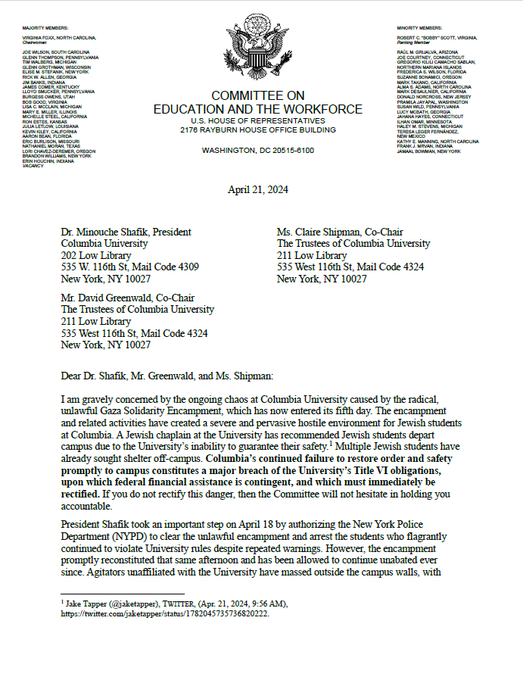 Rep. Virginia Foxx, R-N.C, accused the university of having “waved the white flag in surrender while offering up a get-out-of-jail-free card” to student protesters. She further blamed “radical students and faculty” for interrupting the disciplinary process, and called protesters “antisemites.” (Students are facing accusations of violating the school’s policies on protest, and not harassment or bias against Jewish students.)