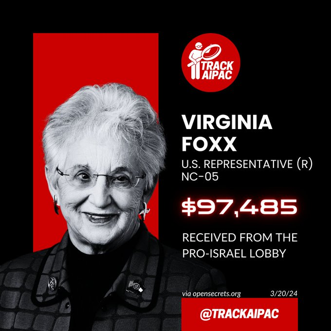 AIPAC Rep. Virginia Foxx has collected nearly $100,000 from the Israel lobby. She is acting on behalf of a foreign government committing genocide. #RejectAIPAC