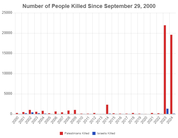 At least 52,022 Palestinians and 2,798 Israelis have been killed by someone from the other side since 2000.