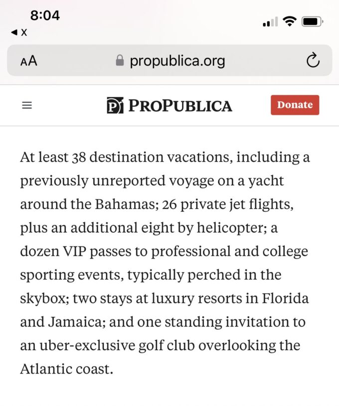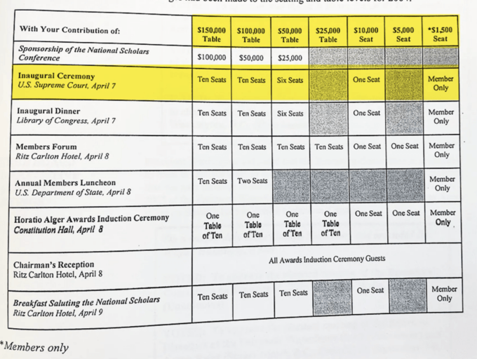 + According to the Pro Publica report, one of Thomas’s long-time benefactors, the billionaires of the Horatio Alger Society, used him to literally auction off access to the Court building itself: “ProPublica examined boxes of the association’s historical archives, including financial records that show the group has required donations of at least $1,500 $7,500 for nonmembers – to attend the Supreme Court event. In 2004, those who donated $100,000 for a table at the main ceremony got 10 seats inside the Supreme Court.”