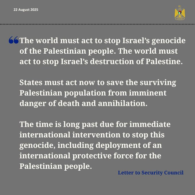 In an urgent letter to the Security Council in regards to the declaration of famine in Gaza, the State of Palestine affirmed: