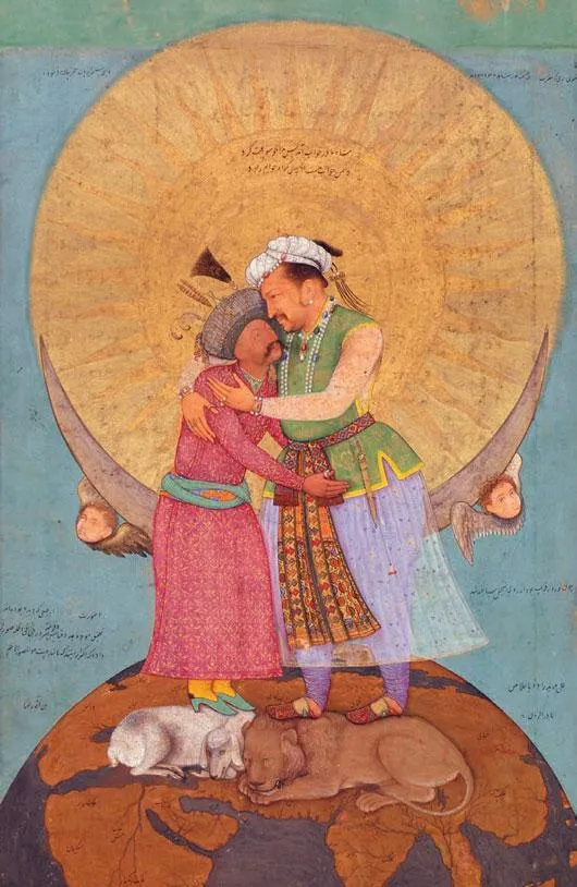 The two paintings display Jahangir, whose Persian name means “Conqueror of the World.” His nemesis was Shah Abbas the Great, the shah of Iran, generally considered the greatest ruler of the Safavid dynasty.